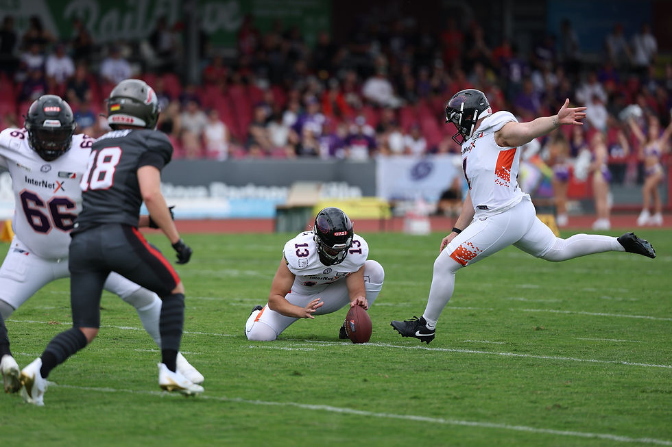 Balou: Als Kicker bist du ja auch von vielen anderen Faktoren abhängig … Klappt der Snap richtig, macht der Holder seinen Job, passt das Blocking … trotzdem schauen alle auf den Kicker, wenn das Ding daneben geht. Kannst du für Laien nochmal erklären, was alles für einen gelungen Kick passen muss und wie gehst du damit um, dass wenn es schief geht, alle dich ansehen?